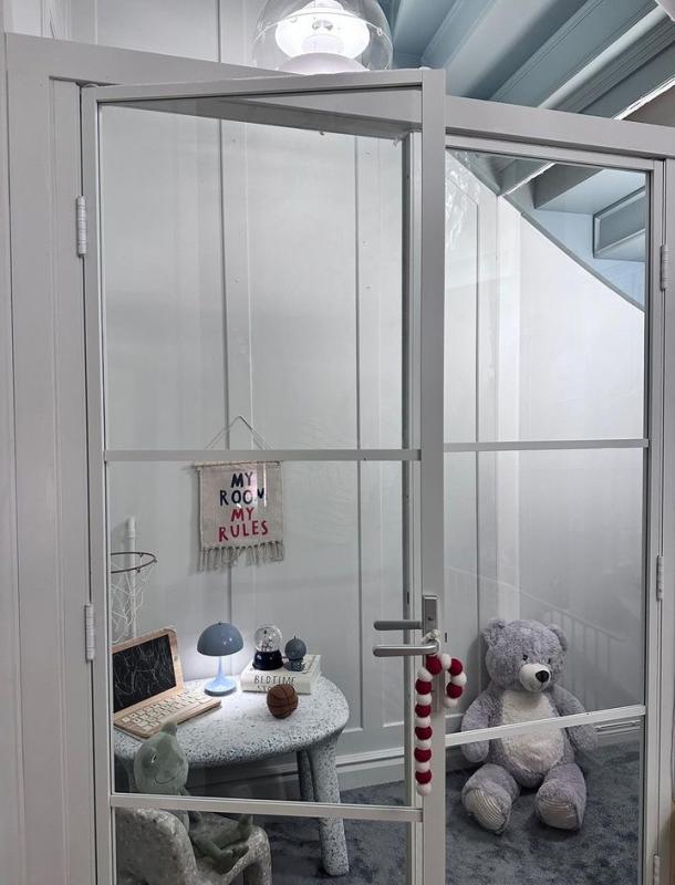 Ett extra litet barnrum blev det hos familjen Alcén när de satte in två dörrar i vitt under den vackra trappan. Dörrarna är 70 cm breda vardera, vilket innebär att de har tre rutor, det lodräta spröjset som finns i väggar & dörrar som mäter 90 & 100 cm i bredd saknas. Höjden är 205 på dessa dörrar som har ett låsbart handtag.