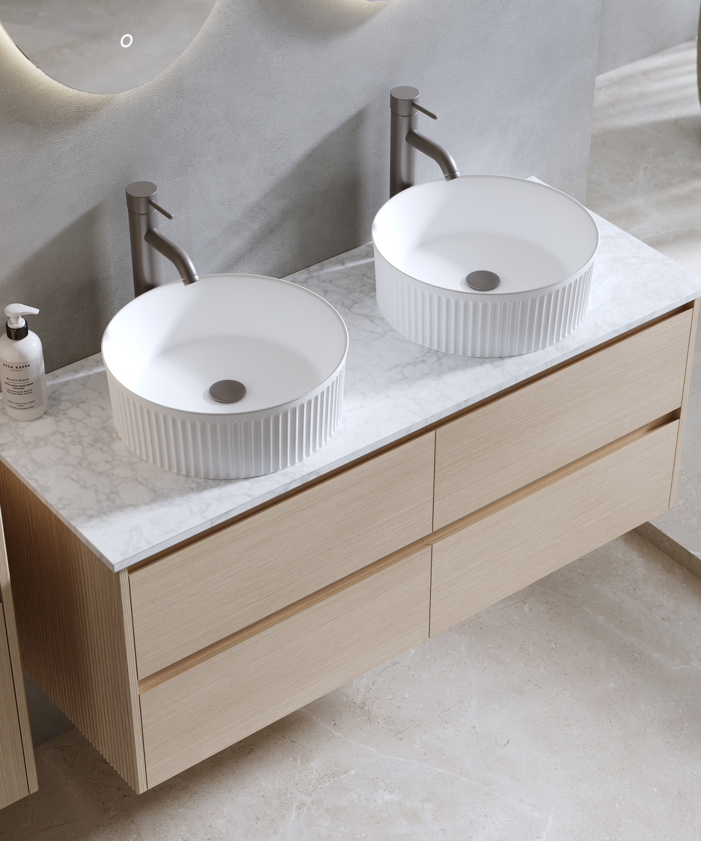 I våra badrumsserie Harmoni används Carrara marmor, en typ av högkvalitativ marmor, känd för sin vita eller blågrå färg med subtila grå ådror, vilket ger den en elegant och tidlös estetik. Dess naturliga variationer i färg och mönster gör varje bit unik, vilket bidrar till dess exklusiva känsla.