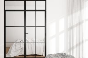 Skapa en Industrivägg med hjälp av dessa industridörrar och industriväggar i härdat säkerhetsglas och profiler av svart aluminium.