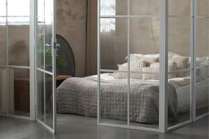 Skapa en Industrivägg med hjälp av dessa industriväggar och industridörr i härdat säkerhetsglas och profiler av vit aluminium.