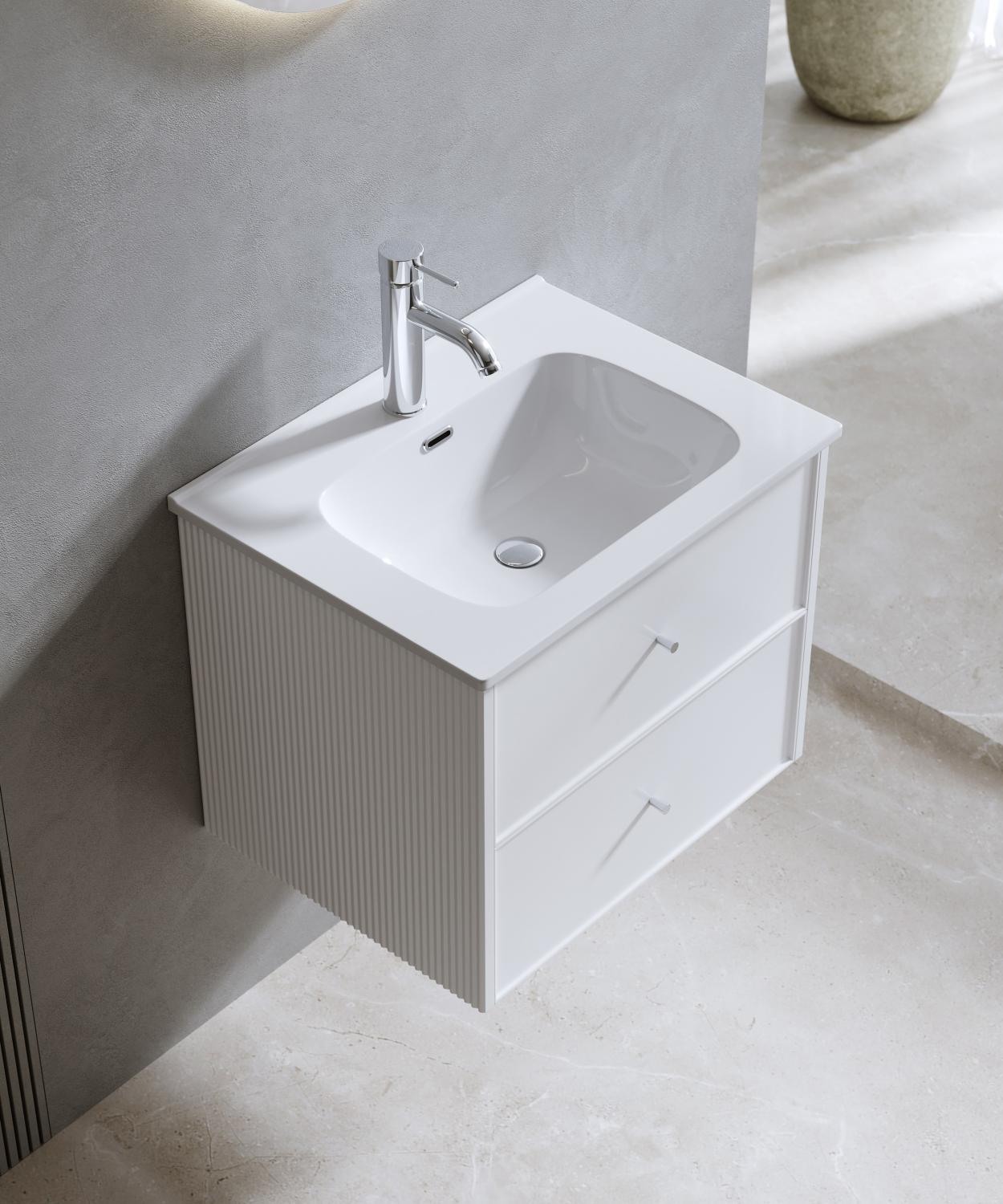 MDF-skåp och keramisk tvättställ, lack- och melaminfinish.