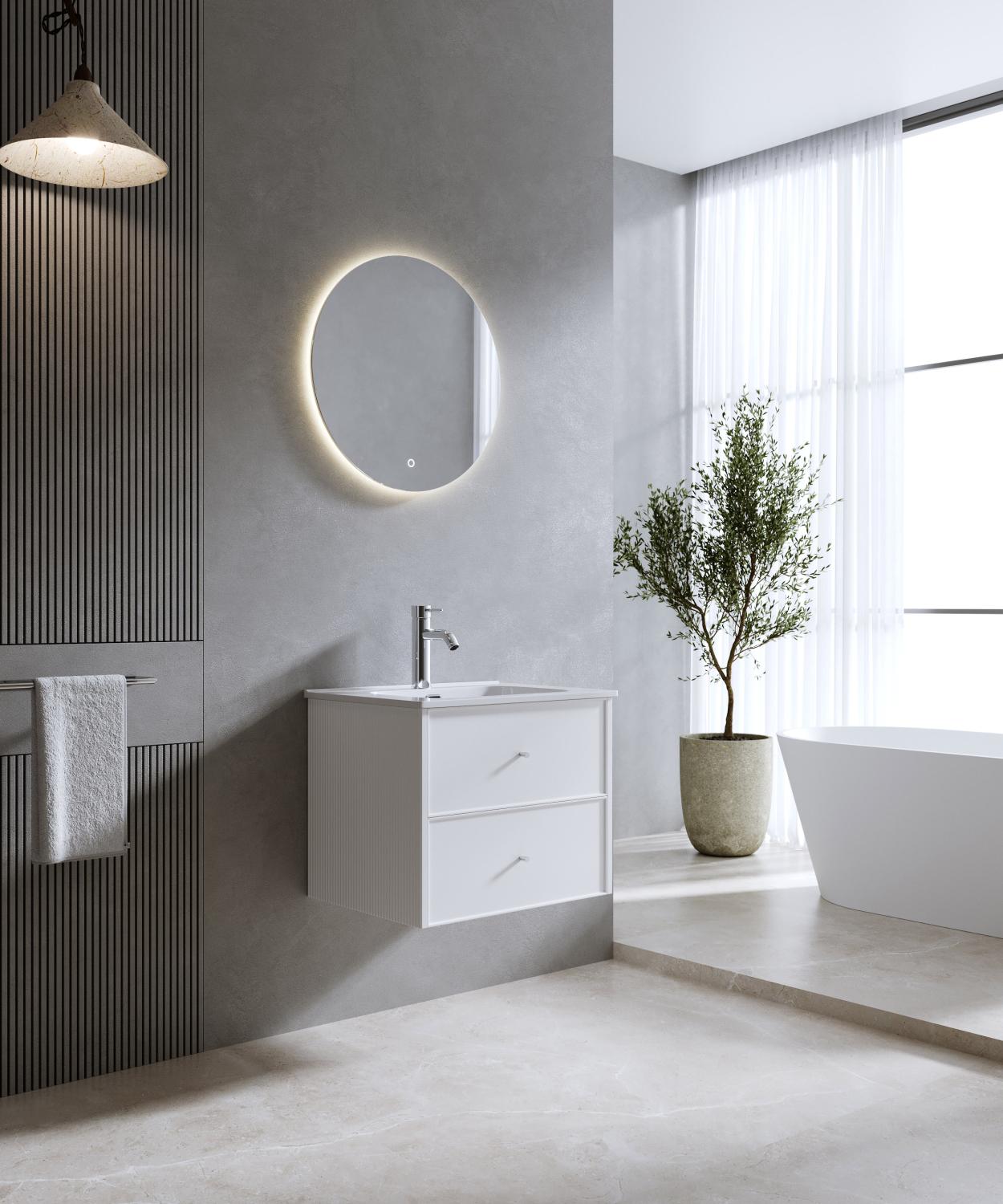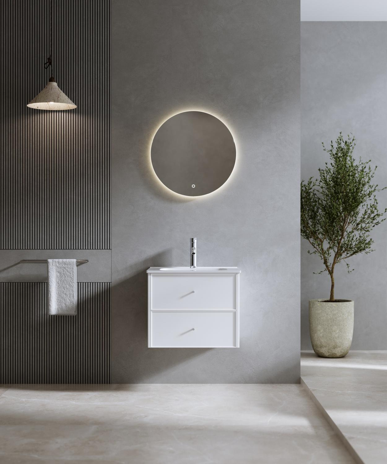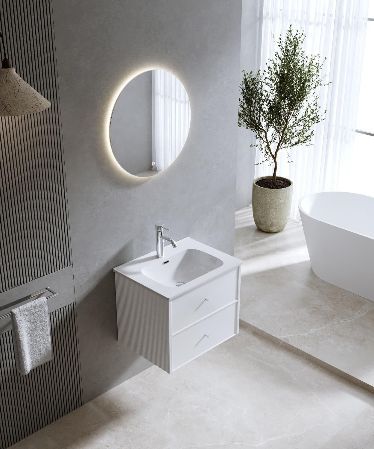 Högkvalitativ mattvit kommod med toppskiva och integrerat handfat i vitt porslin.