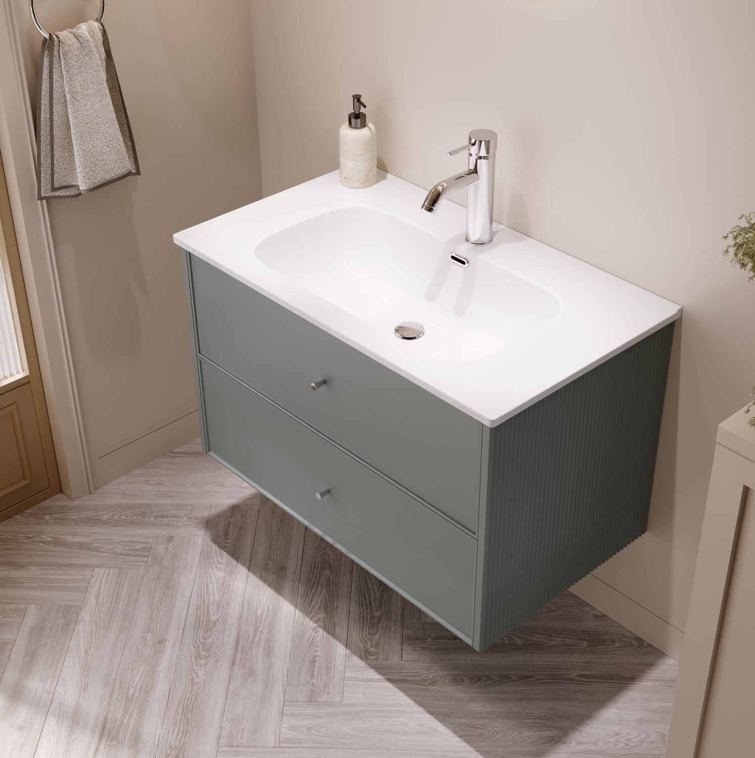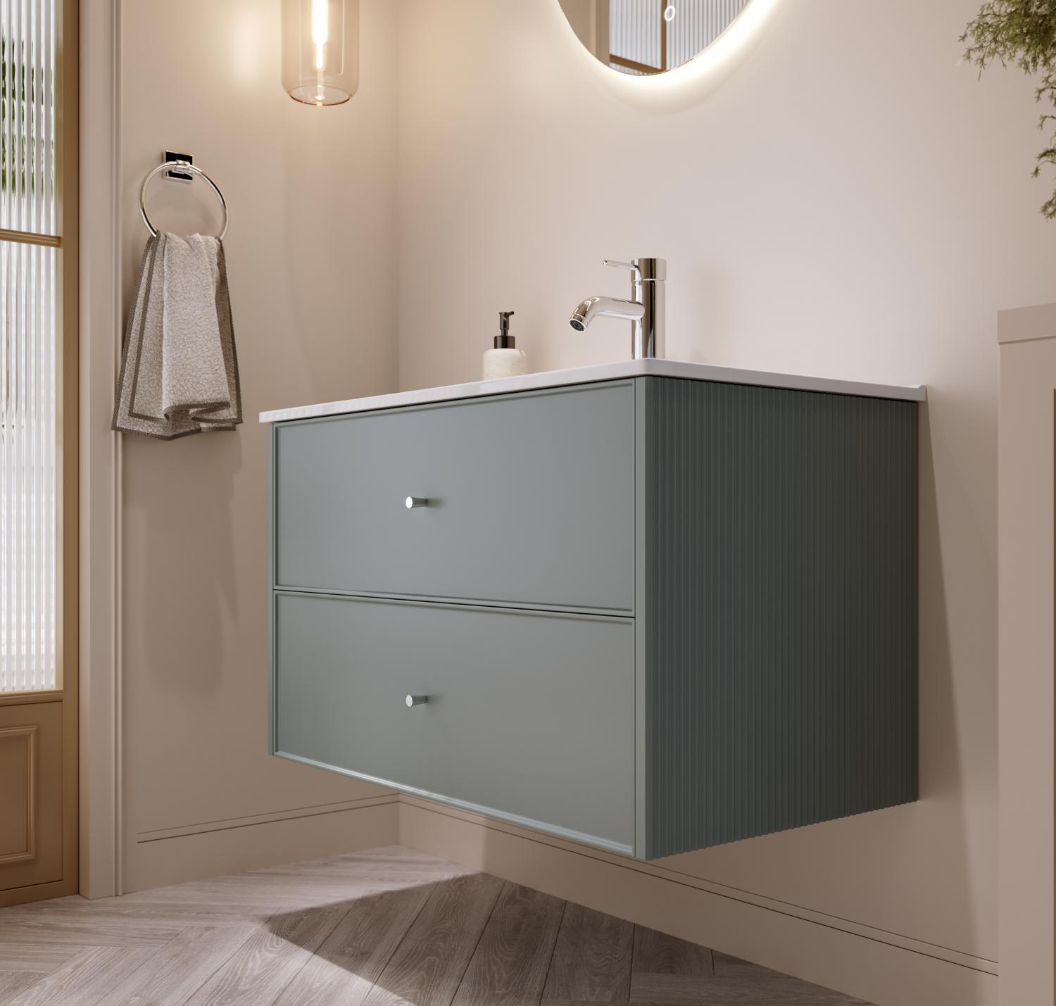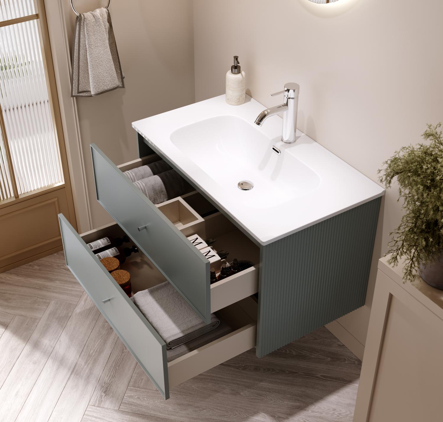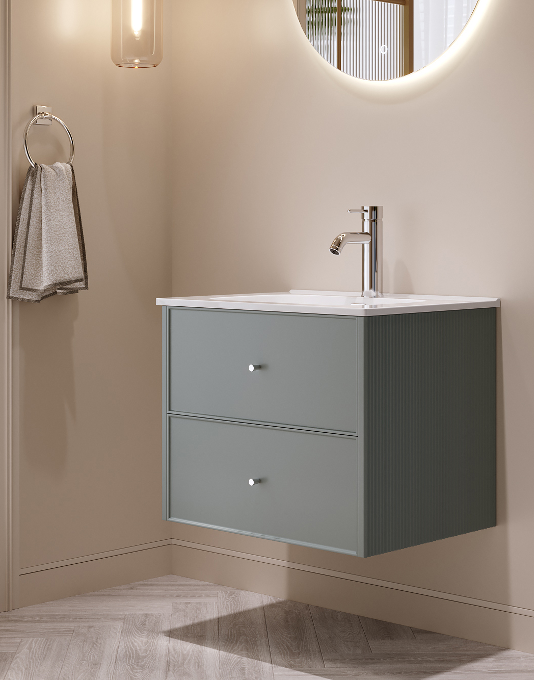 Denna kommod finns i två olika bredder 60, 80 samt tre olika färger, matt vit, ljus ek och Canada Grey som är en ljust gråbeige nyans som gifter sig fint med våra skandinaviska färger. Vår nya färg New Zealand Stone Green en vacker, dovt grönblå nyans som för tankarna till naturens lugn och balans. Den naturliga gröna tonen med inslag av grått skapar en tidlös och harmonisk känsla i badrummet. Med sin mjuka, stenliknande karaktär ger New Zealand Stone Green en elegant kontrast till både ljusa och mörka material och passar perfekt i såväl moderna som klassiska badrumsmiljöer.