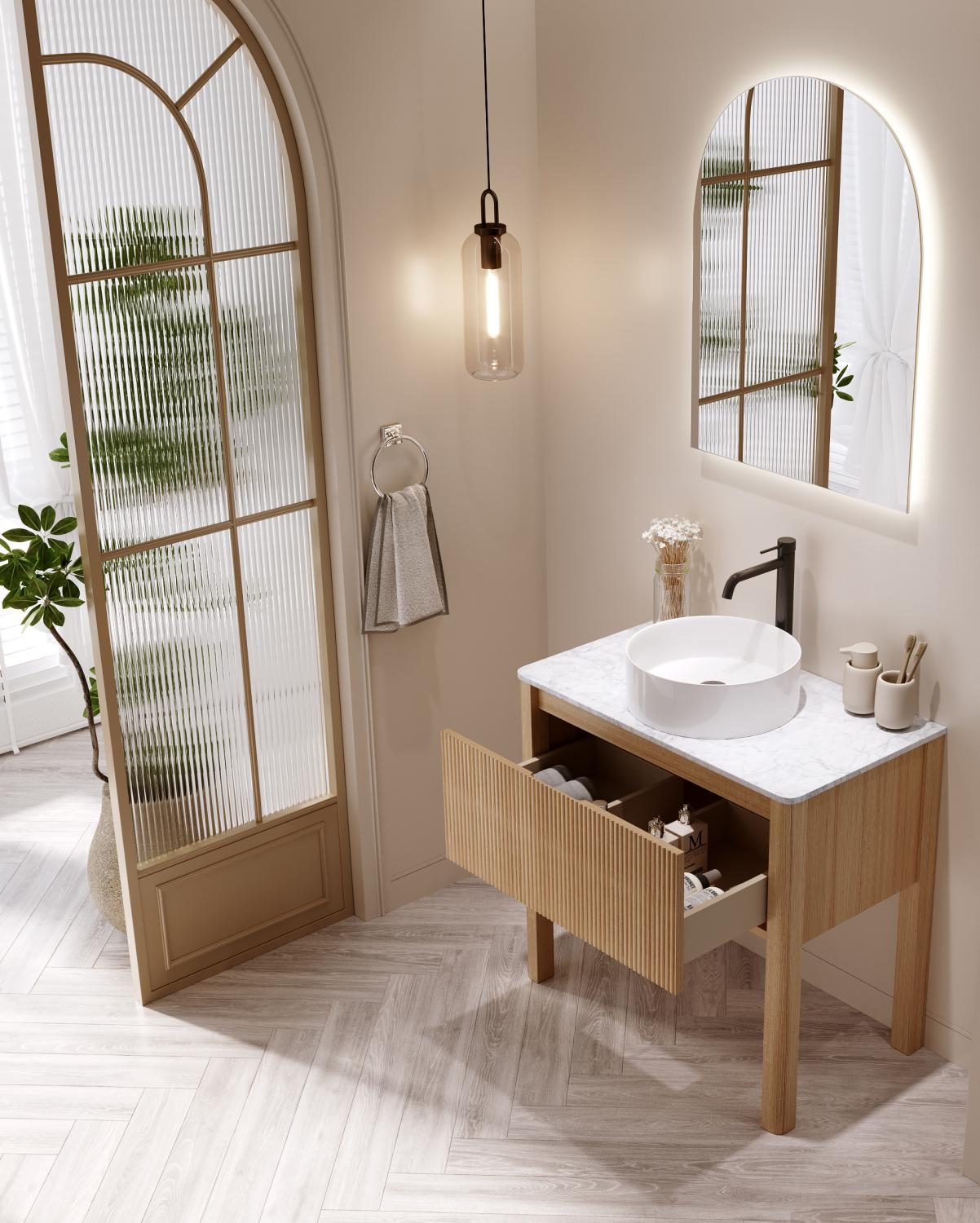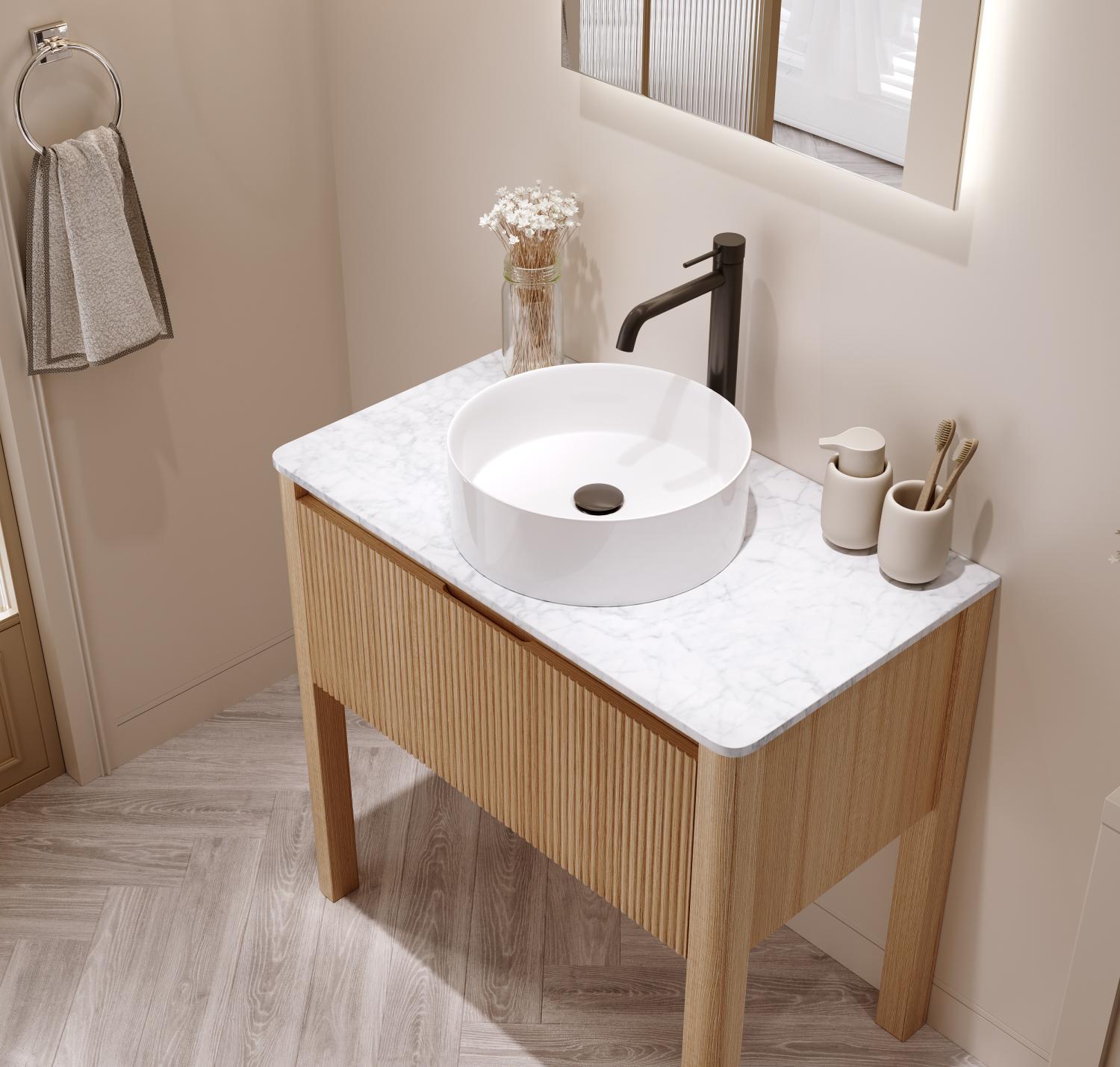 Produktdetaljer: Material: MDF-skåp med toppskiva i exklusiv Carrara-marmor Tvättställ: Ovanpåliggande i vit porslin, slät insida för enkel rengöring och smart utformad för att förhindra stänk Lådor: Mjukt stängande med indelning för optimal förvaring; insidan i matchande Canadian Grey-nyans Design: Släta lådfronter med linjerade och räfflade kortsidor Praktisk info: Levereras färdigmonterad Golvstående modell med bottenventil Ingår i paketet: bänkskiva, handfat, tvättställsskåp och popupventil Ingår ej: spegel, blandare och lådindelare Kommod Hvila är en tidlös och funktionell möbel som passar perfekt i moderna skandinaviska badrum, där både stil och förvaring är i fokus