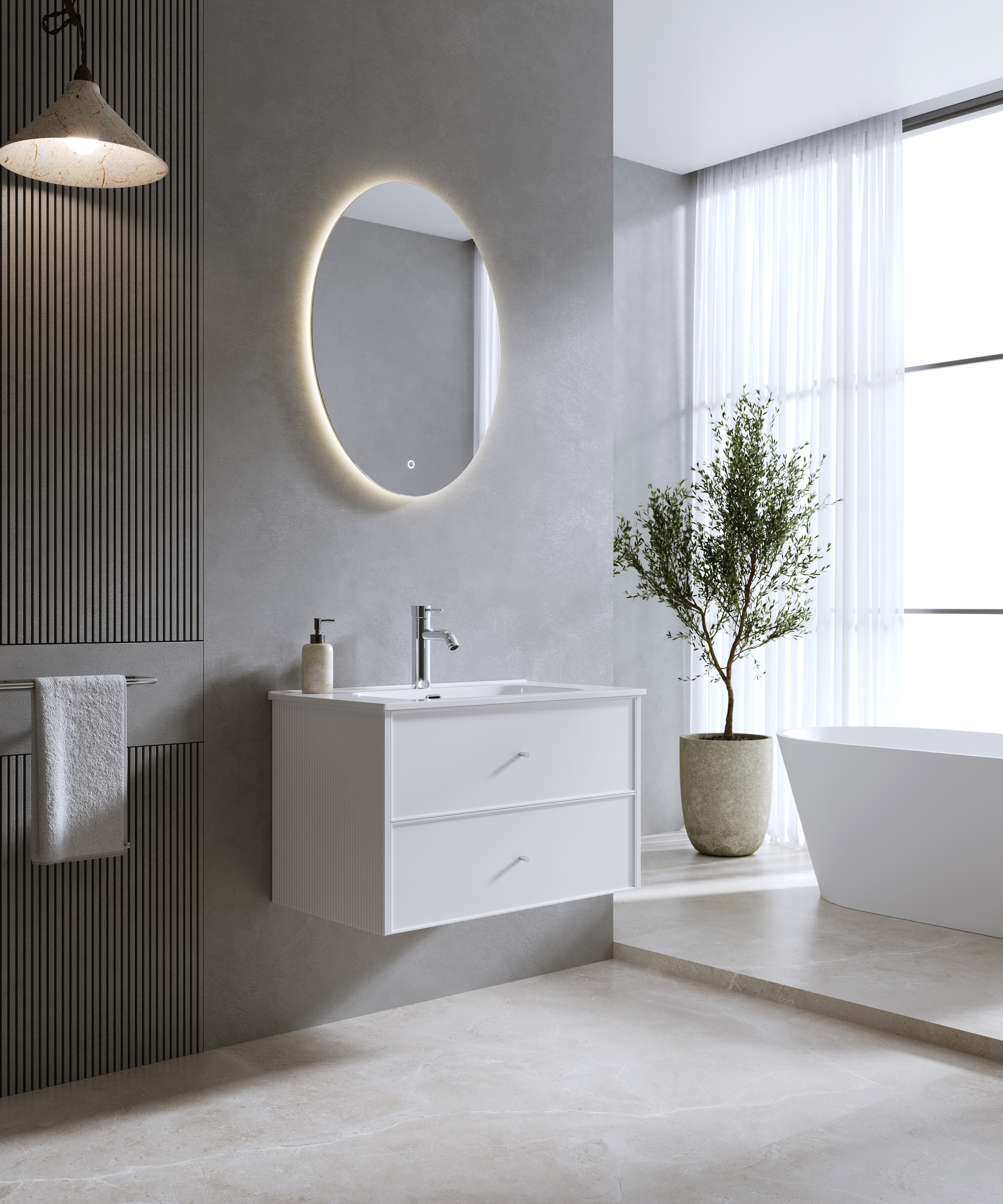 The Harmoni vanity Matte White features smooth drawer fronts, lined side panels, a white porcelain washbasin and soft-closing drawers,