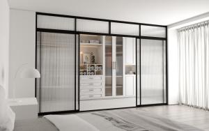 Our ribbed sliding doors are crafted from black-lacquered aluminum and can be used in all rooms of the home or office. Customers appreciate them for their easy installation and ability to be configured in various combinations. The walls are fixed sections while the doors are sliding. The mullions are aluminum, and the glass is laminated tempered ribbed safety glass. With our ribbed sliding doors, you add a new dimension to the room with both sound-insulating and visually appealing privacy.
