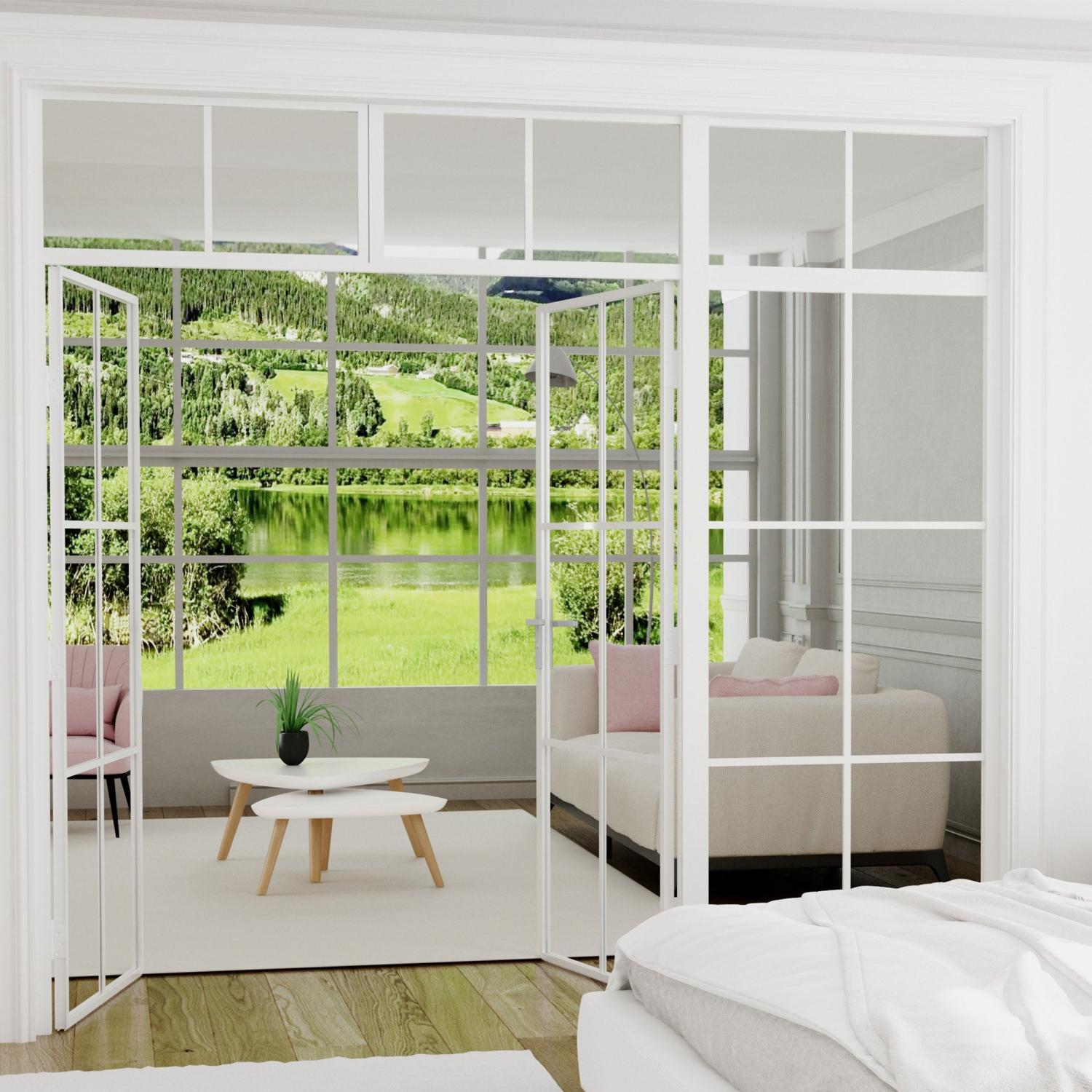 Keep the natural light in the room with our industrial walls in black-painted aluminum. Our industrial walls and doors can be used in every room of the home, even in the bedroom. They are easy to assemble and can be constructed in various combinations with different lengths and heights, as the parts can be easily put together, creating a "room within a room." The mullions are also made of aluminum for an industrial feel. Please note that the appearance varies between the walls; 50, 60, 70, 80 cm walls have three windows, while 90, 100 cm walls have six windows.