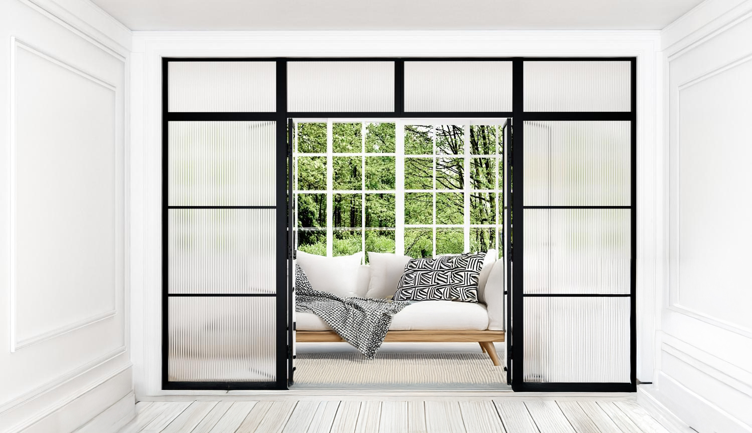 Skapa en Industrivägg med hjälp av dessa industriväggar och industridörrar i härdat linjerat säkerhetsglas och profiler av svart aluminium.