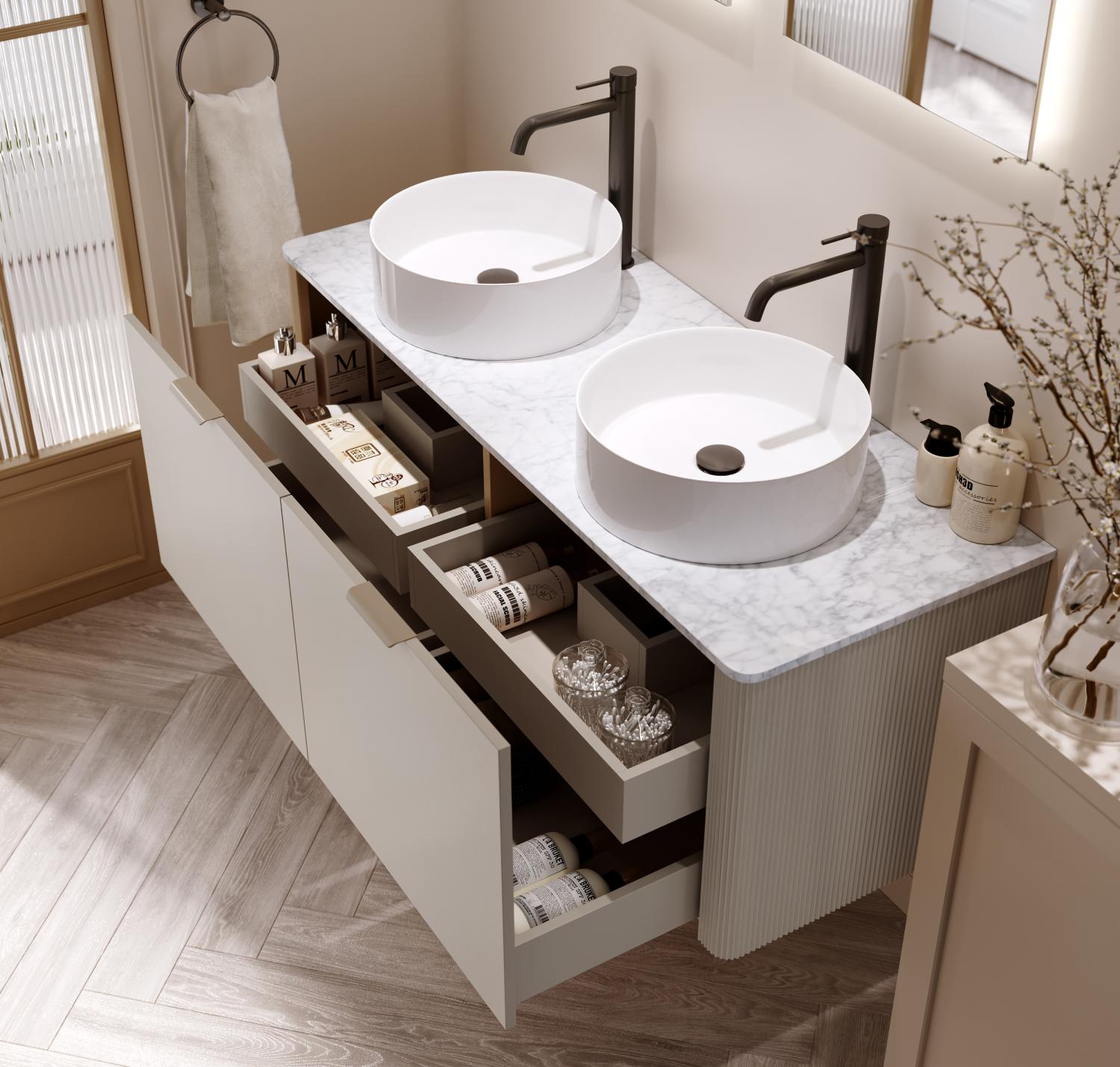 Högkvalitativ mattvit kommod med toppskiva och integrerat handfat i vitt porslin.