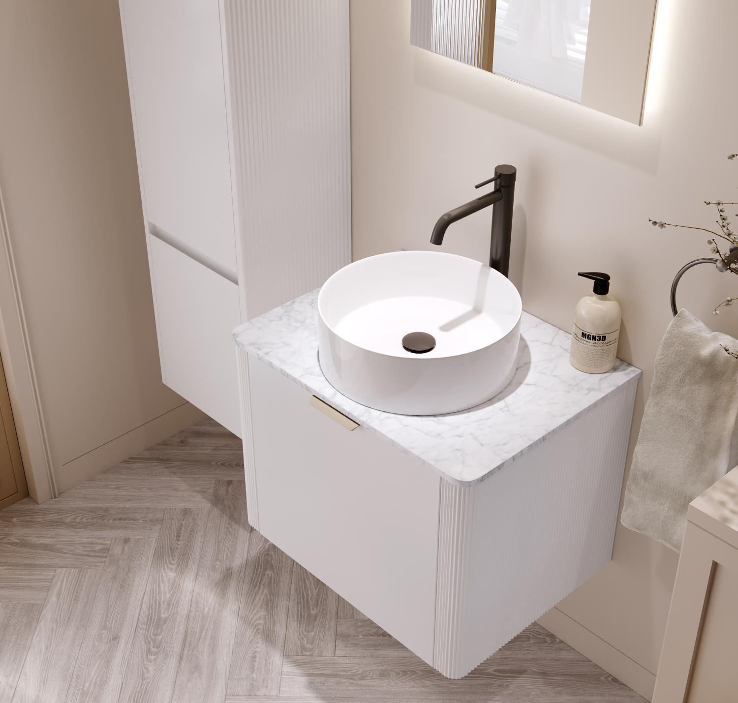 Högkvalitativ mattvit kommod med toppskiva och integrerat handfat i vitt porslin.