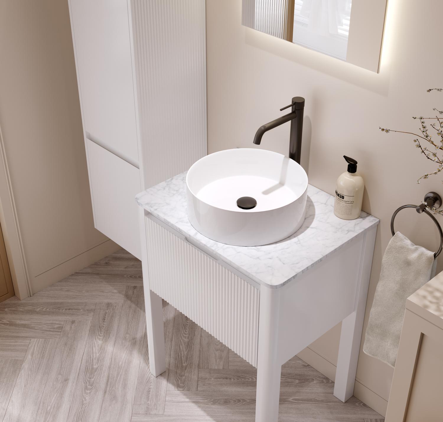 Produktdetaljer: Material: MDF-skåp med toppskiva i exklusiv Carrara-marmor Tvättställ: Ovanpåliggande i vit porslin, slät insida för enkel rengöring och smart utformad för att förhindra stänk Lådor: Mjukt stängande med indelning för optimal förvaring; insidan i matchande Canadian Grey-nyans Design: Släta lådfronter med linjerade och räfflade kortsidor Praktisk info: Levereras färdigmonterad Golvstående modell med bottenventil Ingår i paketet: bänkskiva, handfat, tvättställsskåp och popupventil Ingår ej: spegel, blandare och lådindelare Kommod Hvila är en tidlös och funktionell möbel som passar perfekt i moderna skandinaviska badrum, där både stil och förvaring är i fokus