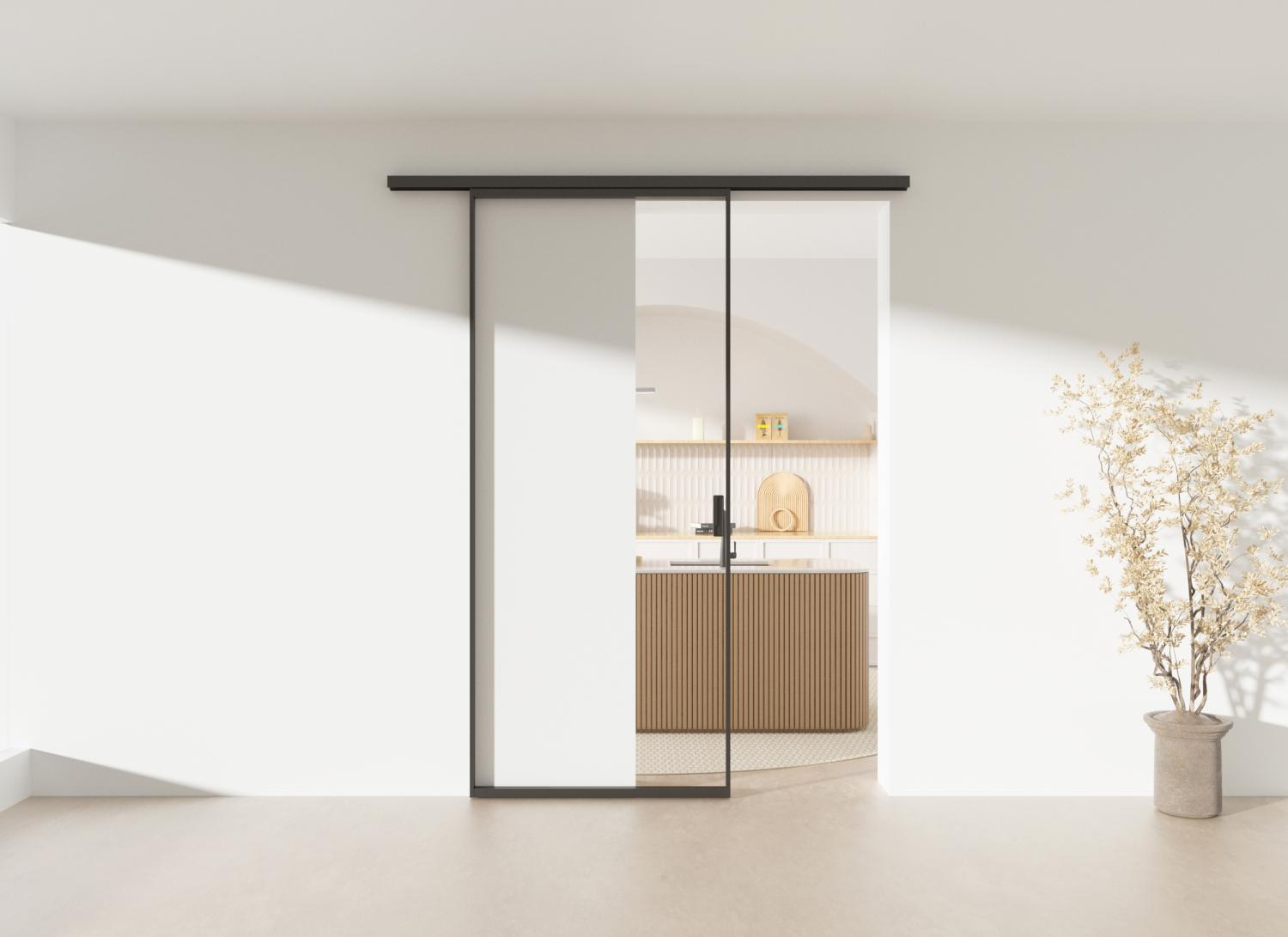 Välj rätt topphängd skjutdörr för ditt hem Alla våra topphängda skjutdörrar är i svart aluminium med härdat 6 mm säkerhetsglas.