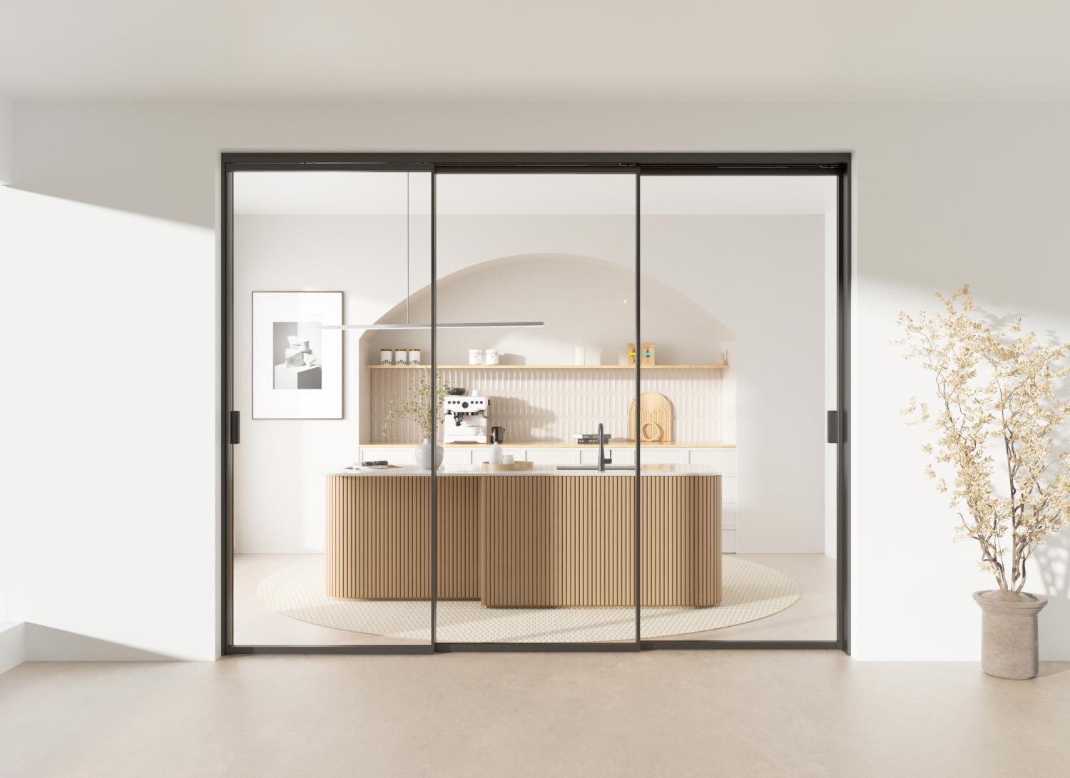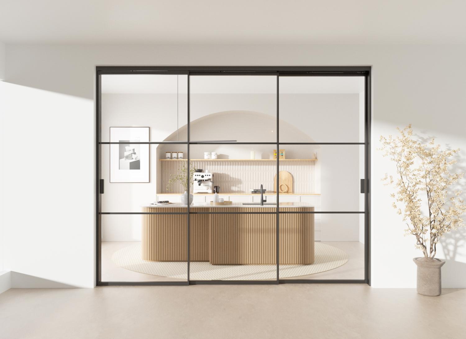 Välj rätt topphängd skjutdörr för ditt hem Alla våra topphängda skjutdörrar är i svart aluminium med härdat 6 mm säkerhetsglas.