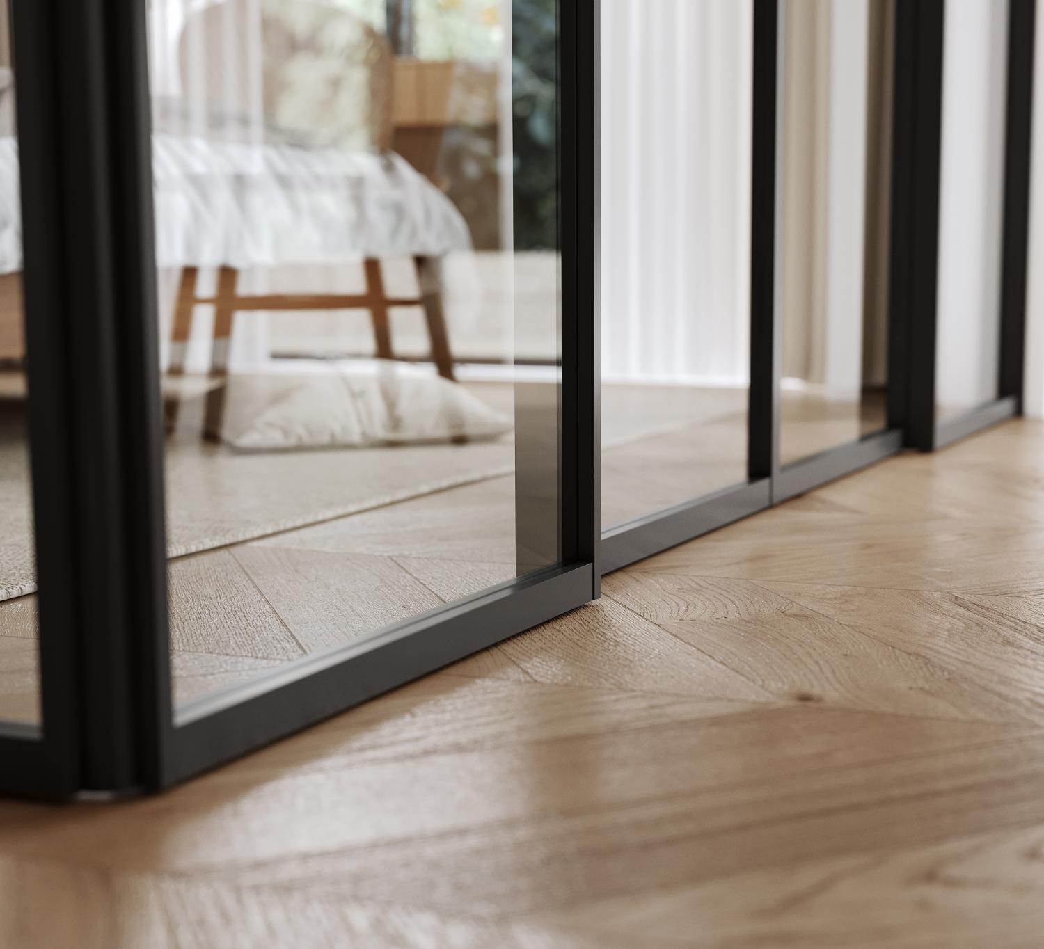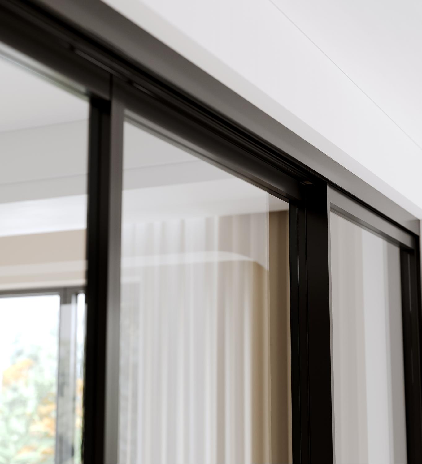 Välj rätt topphängd skjutdörr för ditt hem Alla våra topphängda skjutdörrar är i svart aluminium med härdat 6 mm säkerhetsglas.